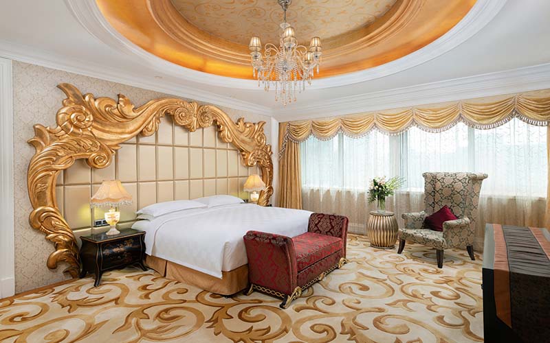 Room facilities: two bedrooms, one living room, one restaurant and one pantry, domestic and international direct dial telephone, LCD TV, mini bar, small safe, hair-dryer, fitness scale, desk lamp, hanger, shoehorn, gas mask, cup set, coat brush, flashlight, Independent shower, massage bathtub, anti-slip mat, bathrobe and slippers, free crib, free broadband internet access, free tea bag and mineral water, coffee.